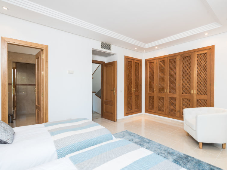 "Perla Blanca", halfvrijstaand huis 4-kamers 230 m2. Het objekt is geschikt voor 6 volwassenen. Ruim en licht, modern en gezellig ingericht: woon-/eetkamer met Digitale TV, air-conditioning, heteluchtverwarming en elektrische rolluiken. Uitgang naar de zitplaats in de tuin. Keuken (oven, afwasmachine, 4 keramische glas kookplaten, broodrooster, waterkoker, magnetron, diepvriezer, elektrische koffiemachine) met air-conditioning. Bovenverdieping: 1 kamer met 2 bedden (90 cm, lengte 190 cm), bad/bidet/WC, wastafel, air-conditioning en elektrische rolluiken. Uitgang naar het terras. 1 kamer met 2 bedden (90 cm, lengte 200 cm), bad/bidet/WC, wastafel, air-conditioning en elektrische rolluiken. Uitgang naar het terras. 2e Verdieping: 1 kamer met Kleedkamer met 1 2-pers bed (180 cm, lengte 200 cm), wastafel, bad/douche/bidet/WC en air-conditioning. Uitgang naar het terras. Natuurstenen vloeren. Groot balkon. Terrasmeubelen. Zeer mooi uitzicht op de tuin. Ter beschikking: wasmachine, droger, strijkijzer, kinderstoel, kinderbed, haardroger. Internet (WiFi, gratis). Garage (3 Auto's) bij het huis. Geschikt voor families. Rookvrij huis. Rookmelders, brandblusser. VFT/MA/423205 // Reg. Nr.: ESFCTU0000290370004290170000000000000000VFT/MA/423205